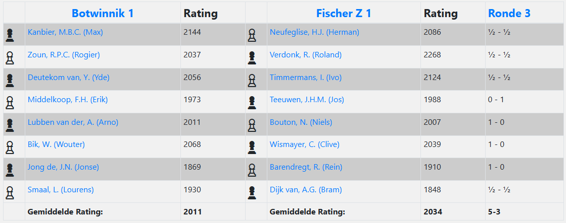 Wouter op bord 6 mocht vervolgens het volgende volle punt binnenhalen. Zijn tegenstander koos voor een Stonewall-structuur tegen Wouters Catalaan, iets waar hij meestal niet vrolijk van wordt, maar dit keer kwam hij goed uit de opening. Met een geniepige paardzet drong hij de zwarte stelling binnen, en toen de pion op e6 viel, was het hek van de dam. Zwart verloor grip op de stelling en Wouter maakte het netjes af. Een overtuigende overwinning en een 3½-1½ voorsprong voor Botwinnik. Een comfortabele marge… toch?
