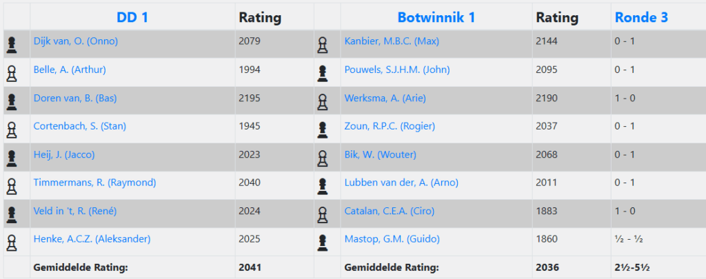 De laatste drie partijen werden uitgespeeld door Rogier op bord 4, Wouter op 5 en Arno op 6. Alle drie leken naar een comfortabele stelling te kijken maar waren daar op verschillende manier gekomen. Rogier was zoals altijd door de afgrond gekropen, en wist de winst te verzilveren op een niet helemaal nauwkeurige methode. Winnen is winnen, een punt is een punt. Voor Wouter was het de hele avond een prettige stelling maar was het voordeel nog niet zo heel groot. Uiteindelijk wist ook Wouter een manier te vinden om zijn tegenstander het bos in te sturen en een puntje te pakken. Arno op bord 6 was nog de persoon met de lekkerste stelling van de drie aan het eind. Een mooi centrum, afgestopt tegenspel van de tegenstander en veel dreigingen richting de witte koning. Uiteindelijk was dat voor Arno een koud kunstje en een mooi puntje. 5,5-2,5 als eindresultaat is dan de conclusie.