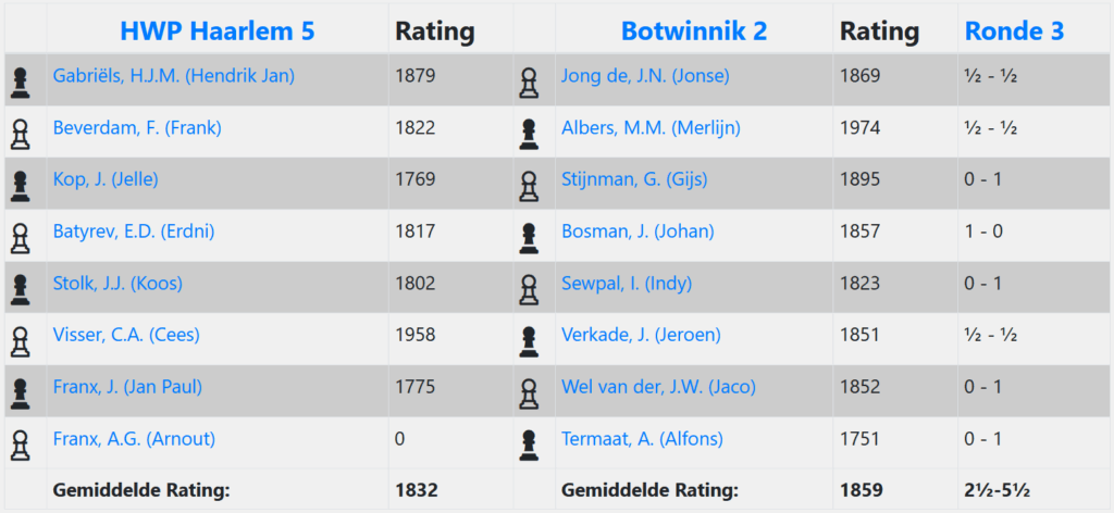 Net toen ik er een hard hoofd in begon te krijgen of wij het laatste punt wel over de streep gingen krijgen gezien al onze nog spelende borden naar mijn mening minder stonden, won Alfons op bord 8 het toreneindspel waar ze naar mijn gevoel al na 10 minuten in zaten. De tegenstander probeerde een toren te offeren voor promotie, maar na niet goed reageren op een schaakje, kon Alfons zijn andere toren tegen de pion offeren en de aangeboden alsnog slaan met een gewonnen eindspel en de matchpunten tot gevolg. 4,5-1,5